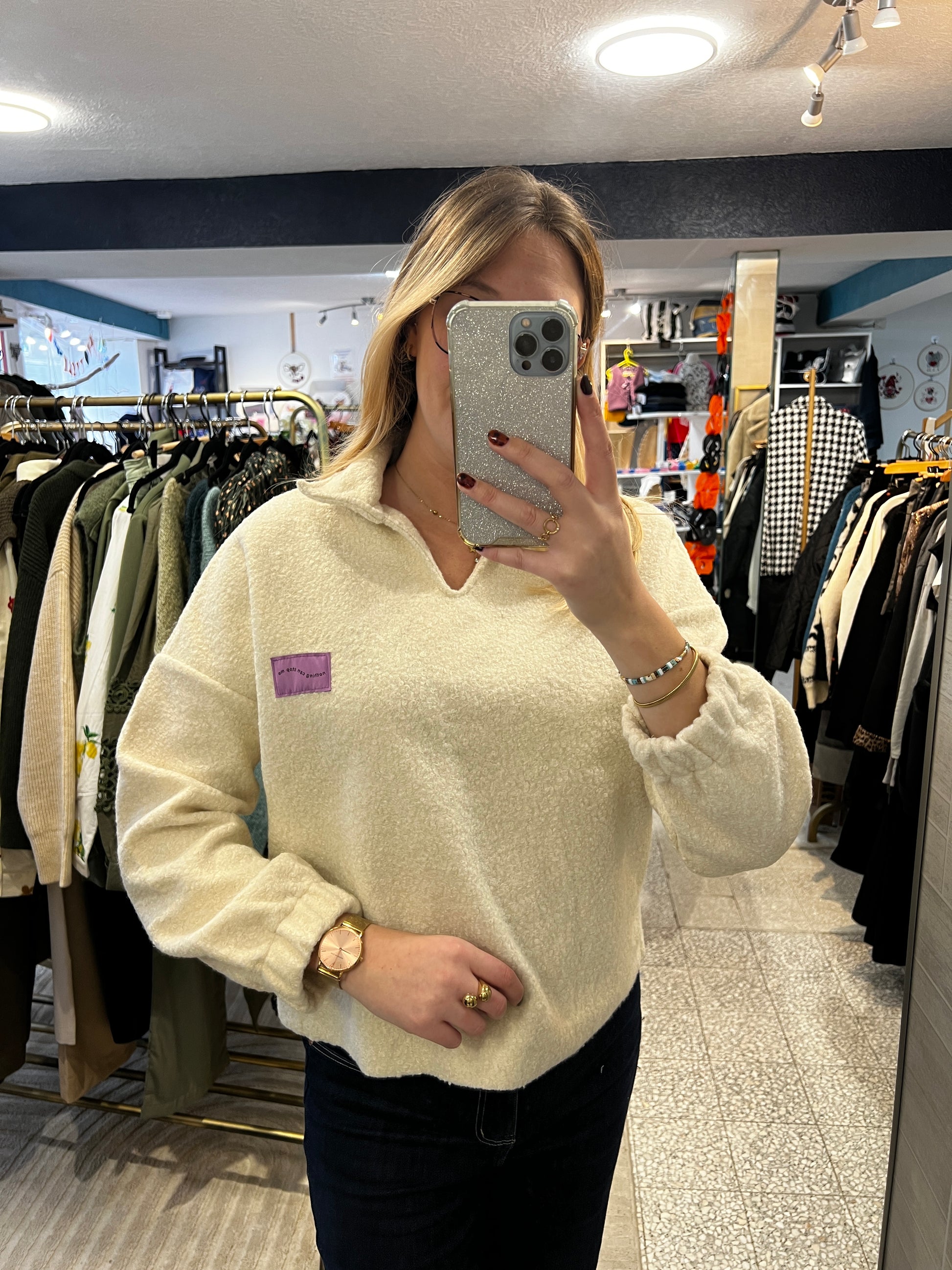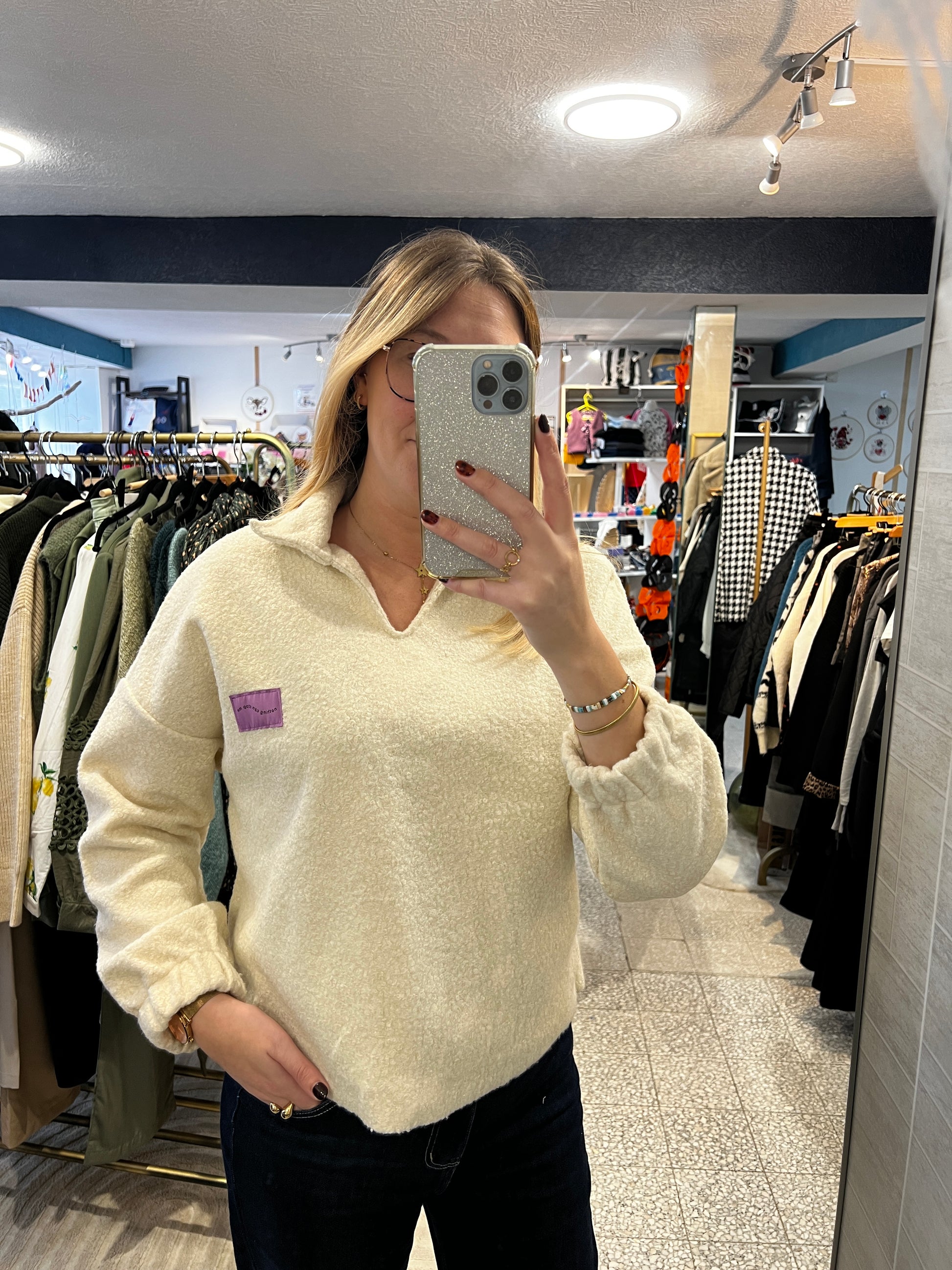 - Pull manches longues en sherpa, couleur écru